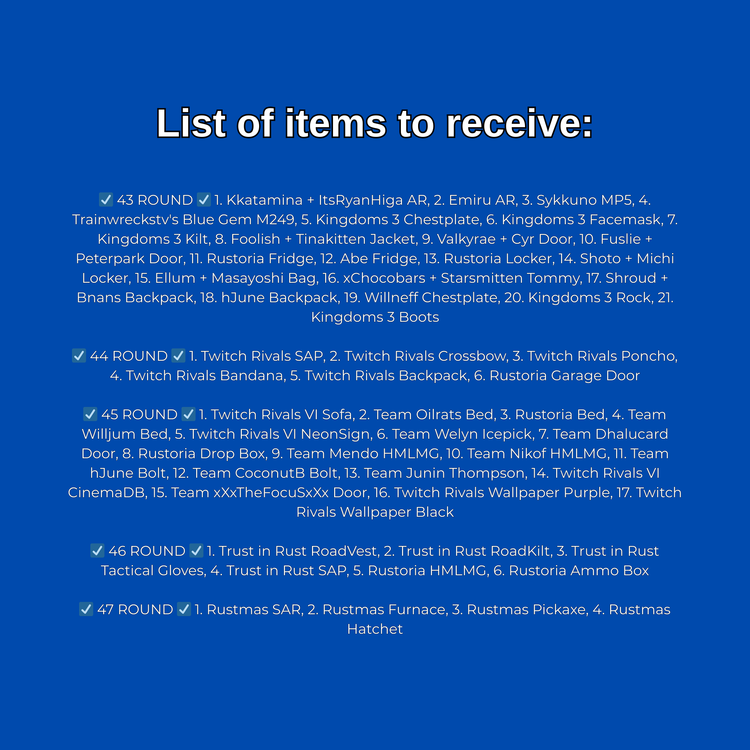 Why Choose Us? -No Ban Risk -24/7 Customer Support -Fast Delivery How It Works? Pay ➜ Get fresh Twitch Drops account login + Instructions Guide Follow instructions ➜ Restart Rust ➜ Get New Skins ⚠️ Each drop can be claimed once per Rust account. Already claimed? Items won't appear. ✅ Works on Steam/PC Only 🛒 List of skins to receive: ☑️ 43 ROUND ☑️ Kkatamina + ItsRyanHiga AR, Emiru AR, Sykkuno MP5, Trainwreckstv's Blue Gem M249, Kingdoms 3 Chestplate, Kingdoms 3 Facemask, Kingdoms 3 Kilt, Foolish + Tinakitten Jacket, Valkyrae + Cyr Door, Fuslie + Peterpark Door, Rustoria Fridge, Abe Fridge, Rustoria Locker, Shoto + Michi Locker, Ellum + Masayoshi Bag, xChocobars + Starsmitten Tommy, Shroud + Bnans Backpack, hJune Backpack, Willneff Chestplate, Kingdoms 3 Rock, Kingdoms 3 Boots ☑️ 44 ROUND ☑️ Twitch Rivals SAP, Twitch Rivals Crossbow, Twitch Rivals Poncho, Twitch Rivals Bandana, Twitch Rivals Backpack, Rustoria Garage Door ☑️ 45 ROUND ☑️ Twitch Rivals VI Sofa, Team Oilrats Bed, Rustoria Bed, Team Willjum Bed, Twitch Rivals VI NeonSign, Team Welyn Icepick, Team Dhalucard Door, Rustoria Drop Box, Team Mendo HMLMG, Team Nikof HMLMG, Team hJune Bolt, Team CoconutB Bolt, Team Junin Thompson, Twitch Rivals VI CinemaDB, Team xXxTheFocuSxXx Door, Twitch Rivals Wallpaper Purple, Twitch Rivals Wallpaper Black ☑️ 46 ROUND ☑️ Trust in Rust RoadVest, Trust in Rust RoadKilt, Trust in Rust Tactical Gloves, Trust in Rust SAP, Rustoria HMLMG, Rustoria Ammo Box ☑️ 47 ROUND ☑️ Rustmas SAR, Rustmas Furnace, Rustmas Pickaxe, Rustmas Hatchet
