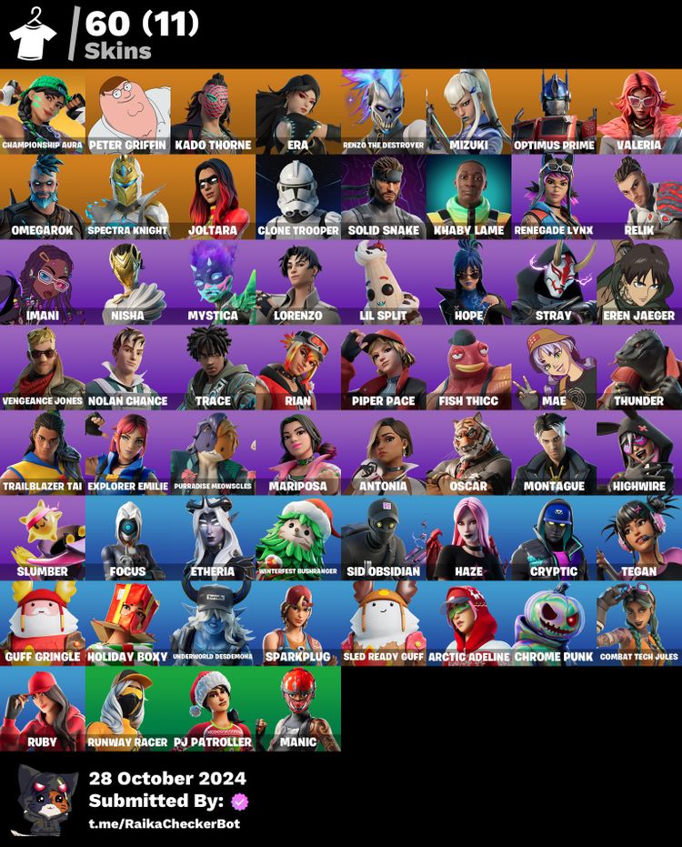 Fortnite Accounts > Rank Ready > 60 Skins < Championship Aura | Peter Griffin | Kado Thorne | Era | Renzo the Destroyer | Mizuki | Optimus Prime | Valeria